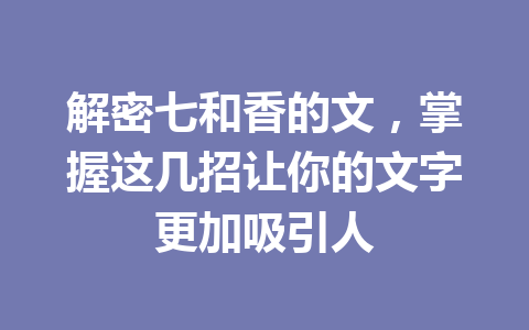 在音乐理论的世界里,七和香的文不仅仅是对音符与和声的解释,更是将音乐转化为文字的艺术。通过运用意象、心情色彩、重复节奏以及个人故事,我们可以让文字更加生动、动人。希望你能掌握这几种技巧,让自己的作品在音乐的世界中绽放出更加迷人的光彩。无论是写作还是创作音乐,最重要的是保持一颗热爱音乐的心,让你的文字和音乐一起飞翔!